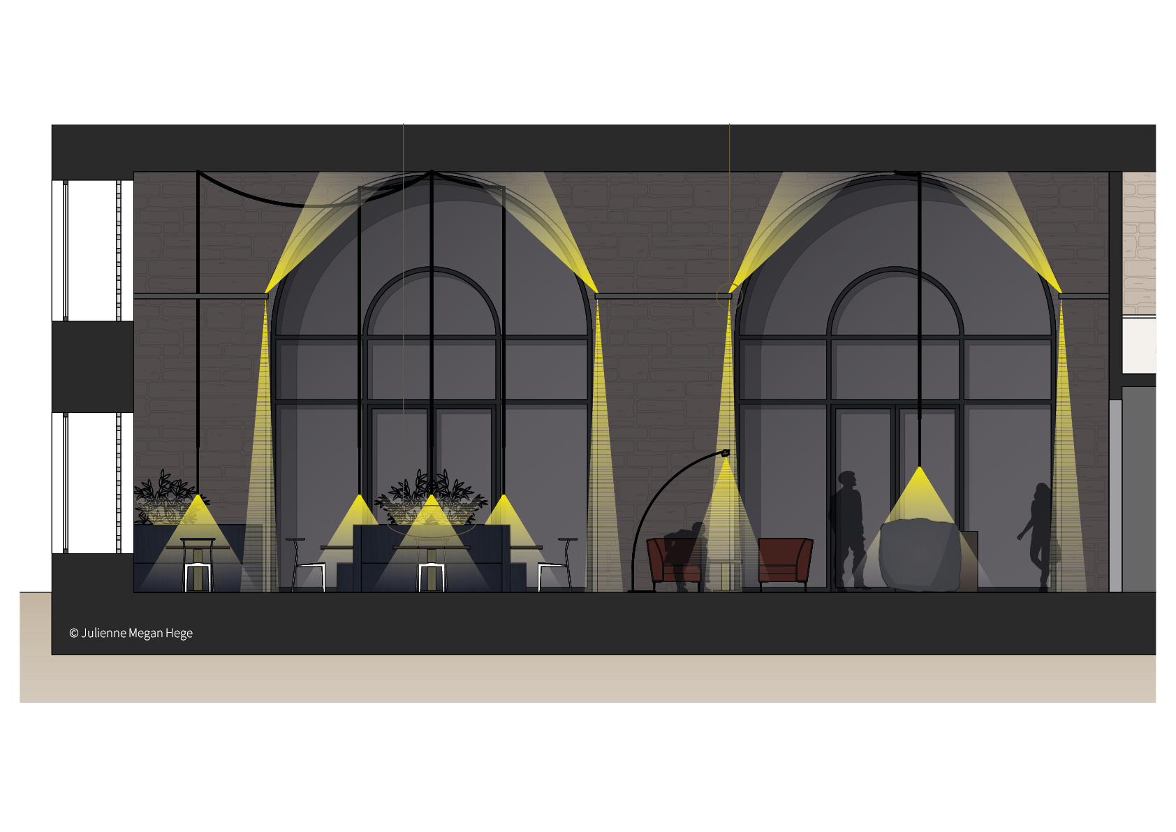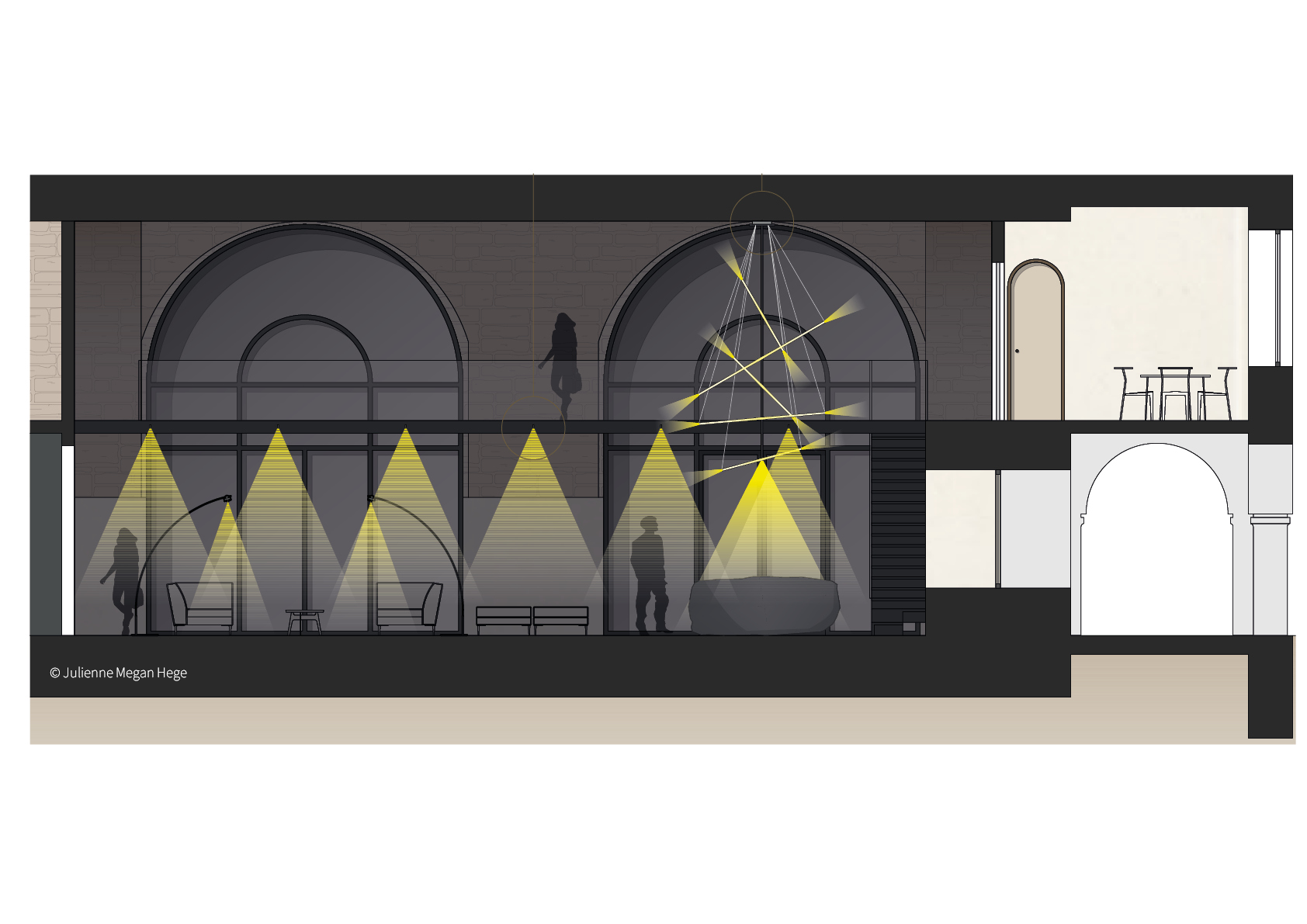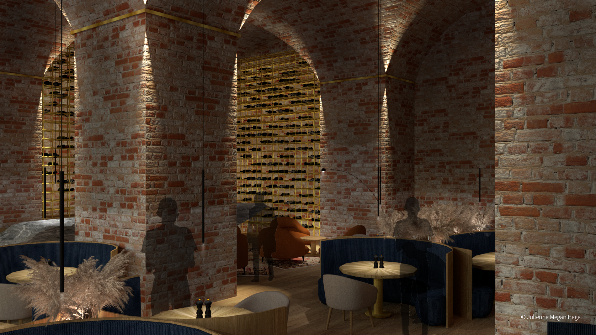 Um die Welten zu verbinden, ist das Restaurant das dunklere Gegenstück der Lobby. Das Lichtkonzept setzt das Kreuzgewölbe in Szene und verleiht einen gemütlichen und geheimnisvollen Charakter.