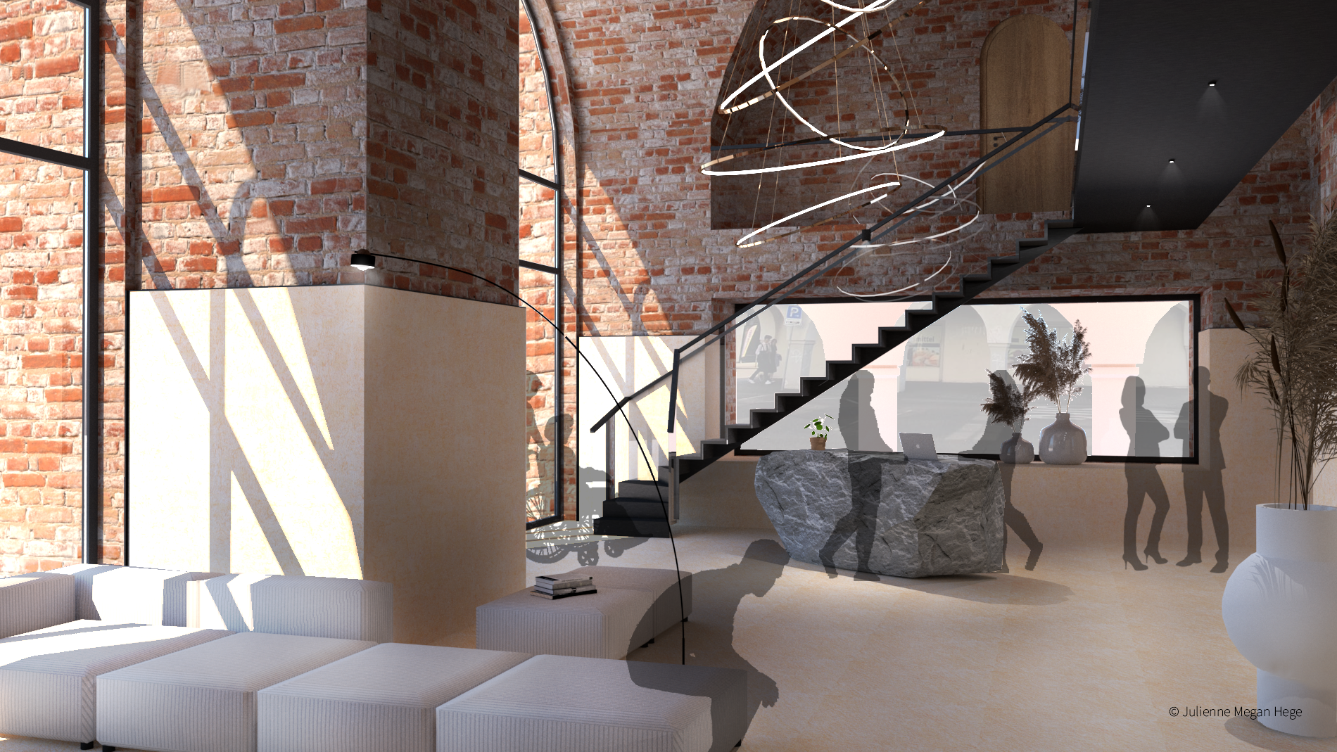 Die Materialien sind hell und natürlich gewählt, um eine harmonische Atmosphäre zu generieren und das historische Mauerwerk zu unterstützen. Durch das Lichtkonzept wird in diesem Bereich eine gemütliche und familiäre Atmosphäre erzeugt, sodass man sich gleich willkommen und zu Hause fühlt.